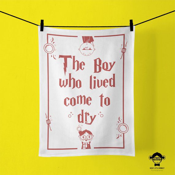 If you have not moved on up to advanced potion making quite yet you will be all too familiar with the mundane voyage that is drying the pots. Well this tea towel makes a mockery of that life and issues a call of arms. The boy who lived Come to dry!