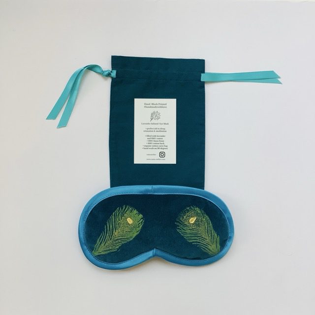 Raina Atelier Teal Velvet Peacock Feathers eye mask, hand block printed, made in luxurious 100% cotton velvet and infused with sweet scented lavender to help you relax and drift off to dream filled night’s sleep.