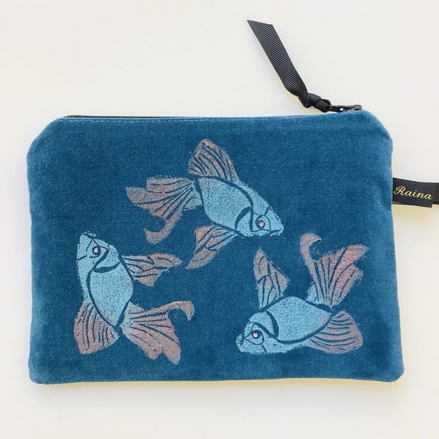 Elevate your accessory game with the Teal Koi Fish velvet zip-up pouch, a true work of art.
