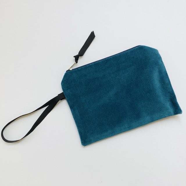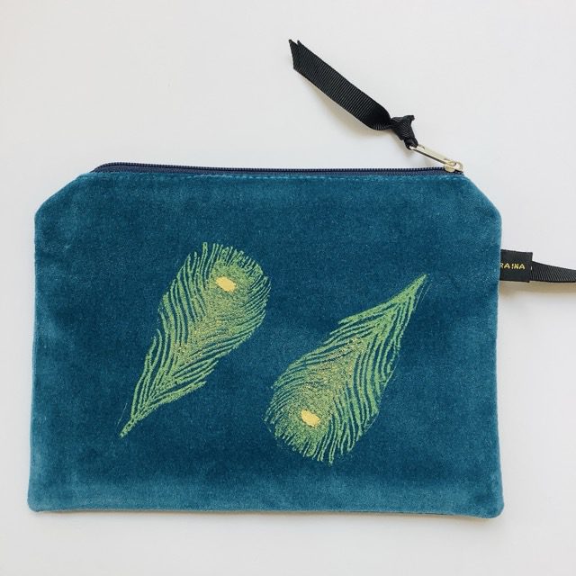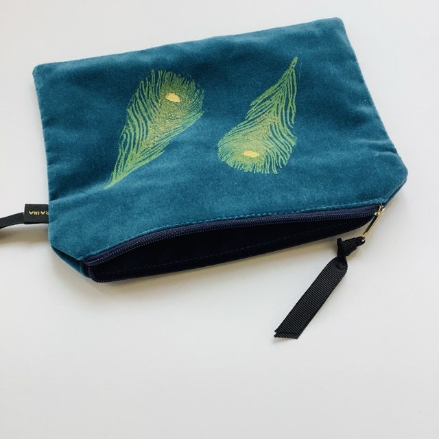 Our hand printed zip-up pouches are made in luxurious 100% cotton velvet feature original block printed Peacock Feathers design with a tiny glimmer of gold detail, printed on the front.
