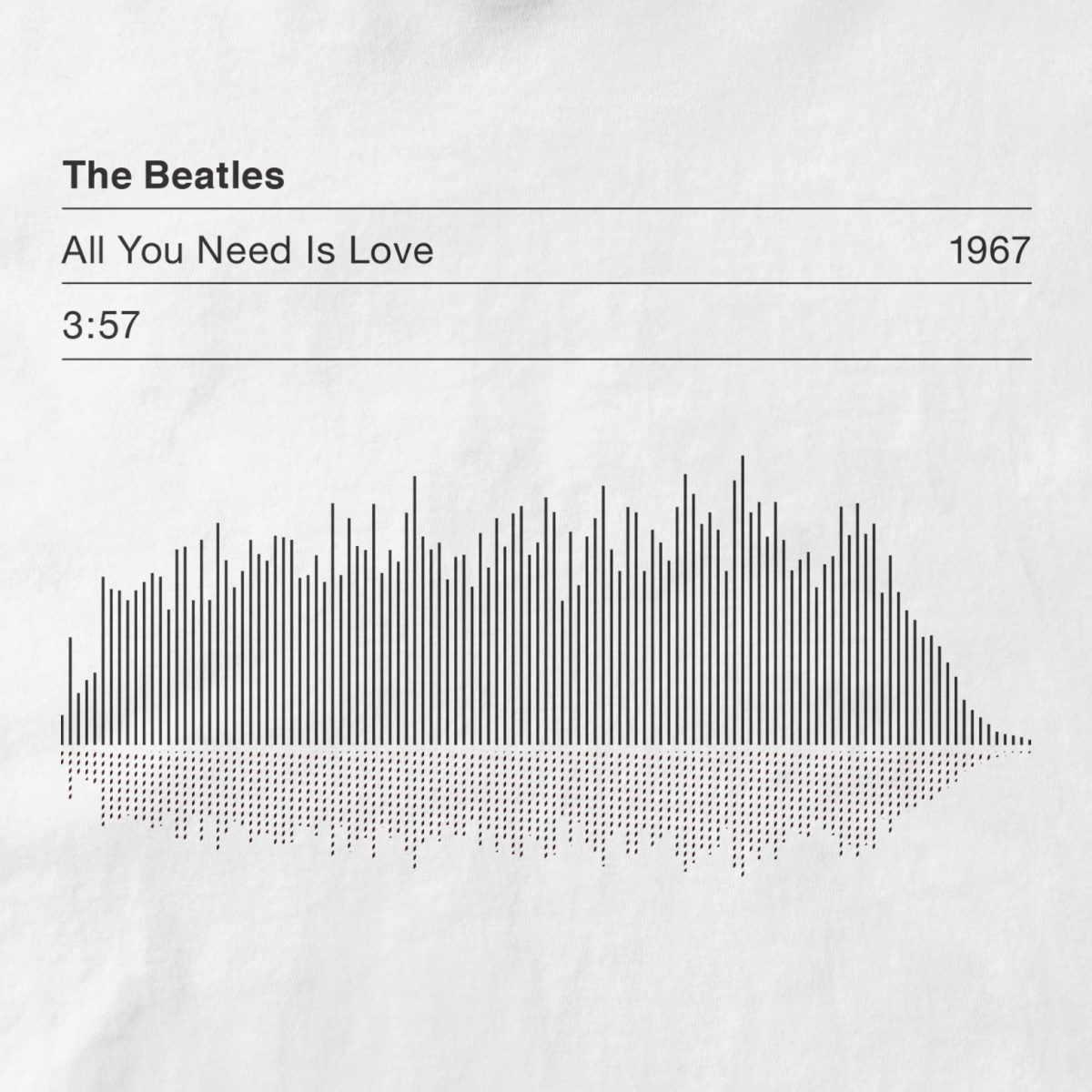 The Beatles Sound Wave T Shirt captures the essence of “All You Need Is Love” with a stunning, hand screen-printed design. This T-shirt proudly displays the song’s graphic sound wave, title, length, and release date. Celebrate an iconic musical milestone while expressing your admiration for The Beatles in a unique and stylish way.