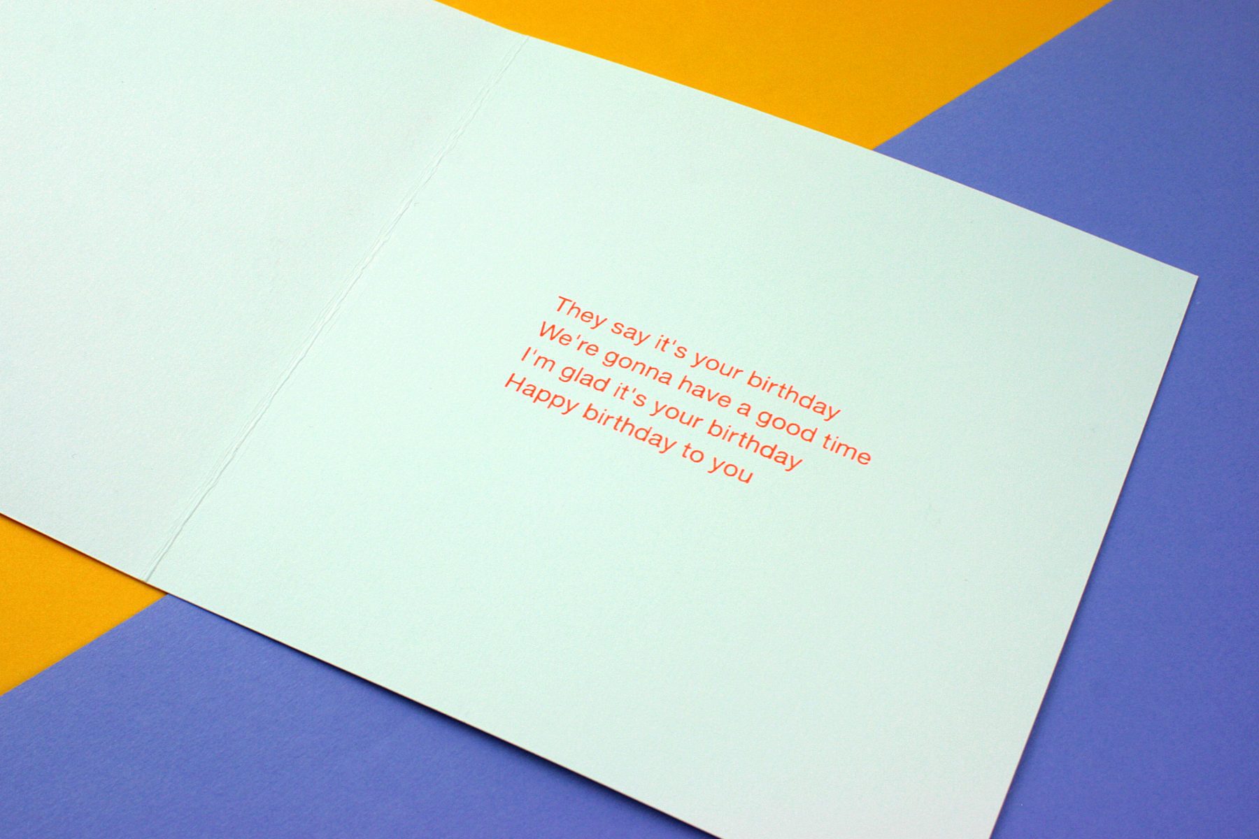 - The Beatles Birthday Card is available in three striking colors: fluoro pink, fluoro orange, and blue.