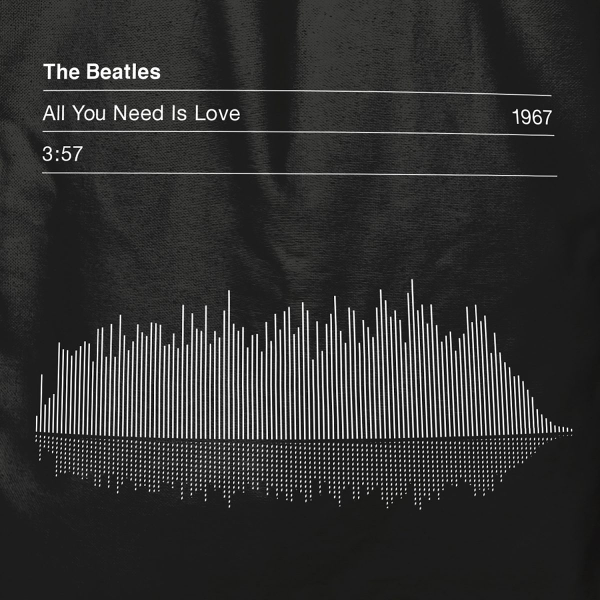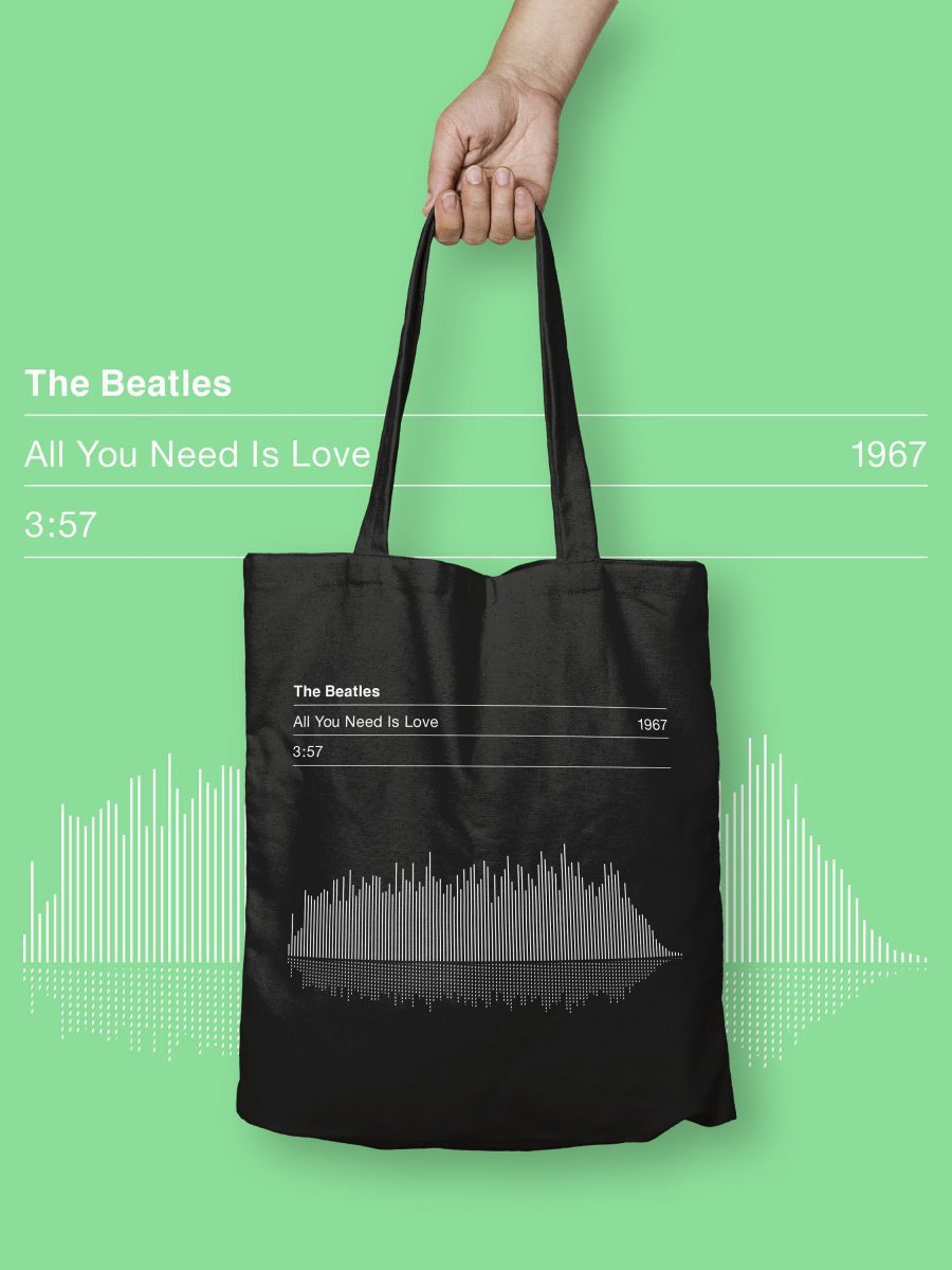 This tote bag displays the graphic sound wave and vital info including the song title, song length, date of release of the Beatles cultural milestone no1 hit ‘All You Need Is Love’.