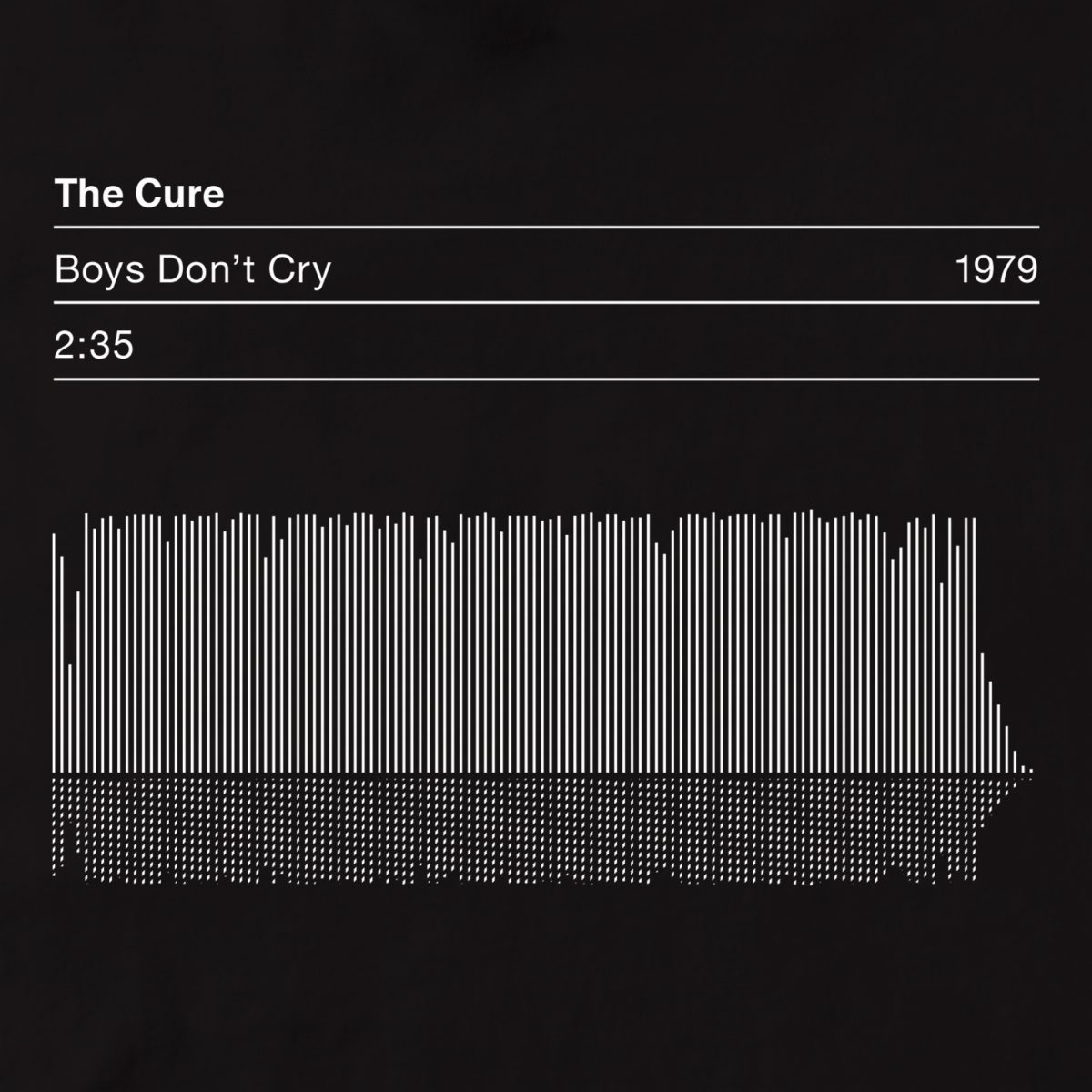 The Cure Boys Don’t Cry Sound Wave T-shirt features a unique, hand screen-printed design that captures the essence of this post-punk anthem. This exclusive Serigrafica7585 design showcases the song’s dynamic sound wave, length, and release date, making it a perfect collectible. Fans of The Cure will appreciate this wearable tribute to one of their most beloved classics.