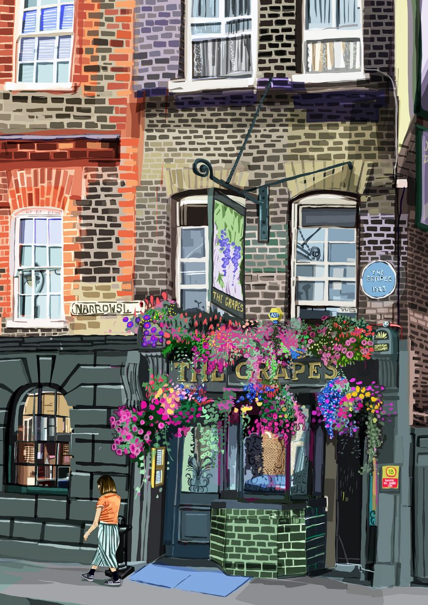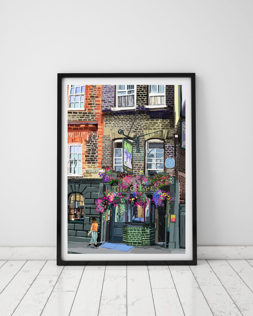 Add a touch of East London’s riverside charm to your home or office with our art print of The Grapes on Narrow Street, Limehouse. Perfect for gallery walls, office spaces, or as a thoughtful gift for friends and family, this print is a timeless tribute to the historic charm and riverside allure of East London.