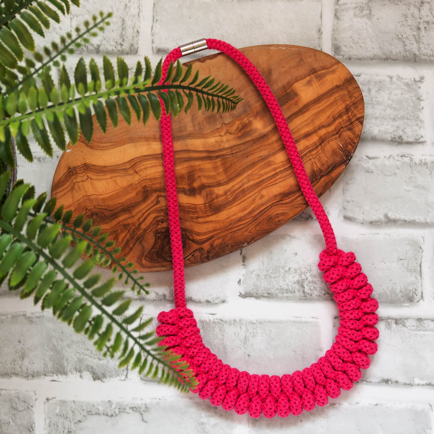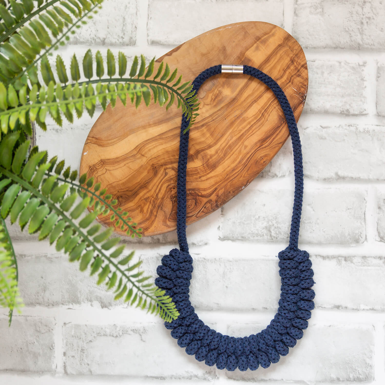 A beautiful handmade necklace. It is made using soft cotton rope. It’s around 60 cm in length. Can be made longer. It has magnetic lockable clasps to give a beautiful finish. This necklace is also hand washable.