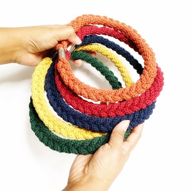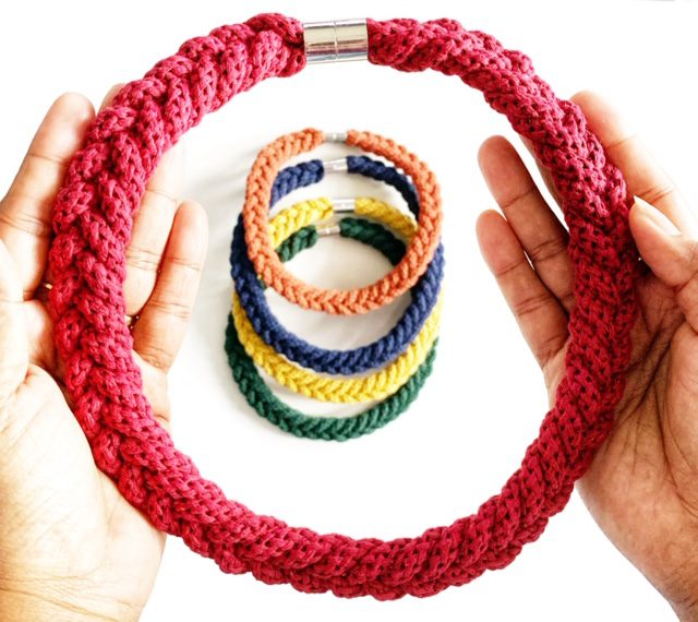 A beautiful handmade necklace. It is made using soft cotton rope. It’s around 45 cm in length. Can be made longer. It has magnetic lockable clasps to give a beautiful finish. This necklace is also hand washable.