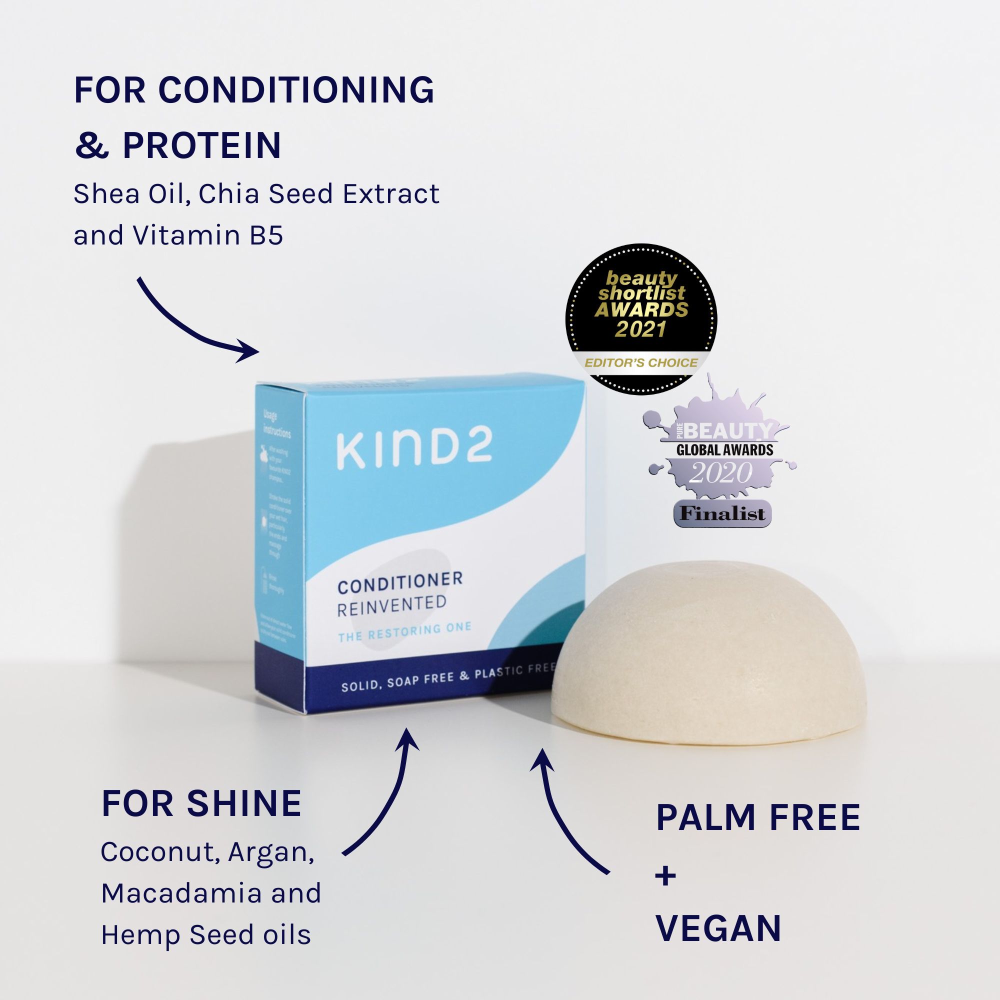 A conditioner bar that really works. For normal, dry, curly or coloured hair. Formulated with Coconut, Argan and Shea Oils plus Cocoa Butter, Chia Seed Extract and Vitamin B5 The Restoring One will detangle, add shine and nourish your hair without leaving it heavy.
