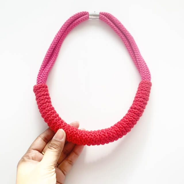 A beautiful handmade necklace. It is made using soft cotton rope. It’s around 70cm in length. Can be made longer or shorter. This necklace is also hand washable. It has magnetic lockable clasps to give a beautiful finish.