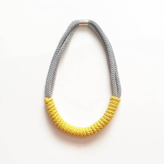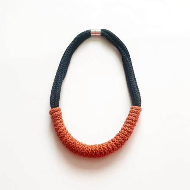 A beautiful handmade necklace. It is made using soft cotton rope. It’s around 65 – 70cm in length. Can be made longer or shorter. This necklace is also hand washable. It has magnetic lockable clasps to give a beautiful finish.