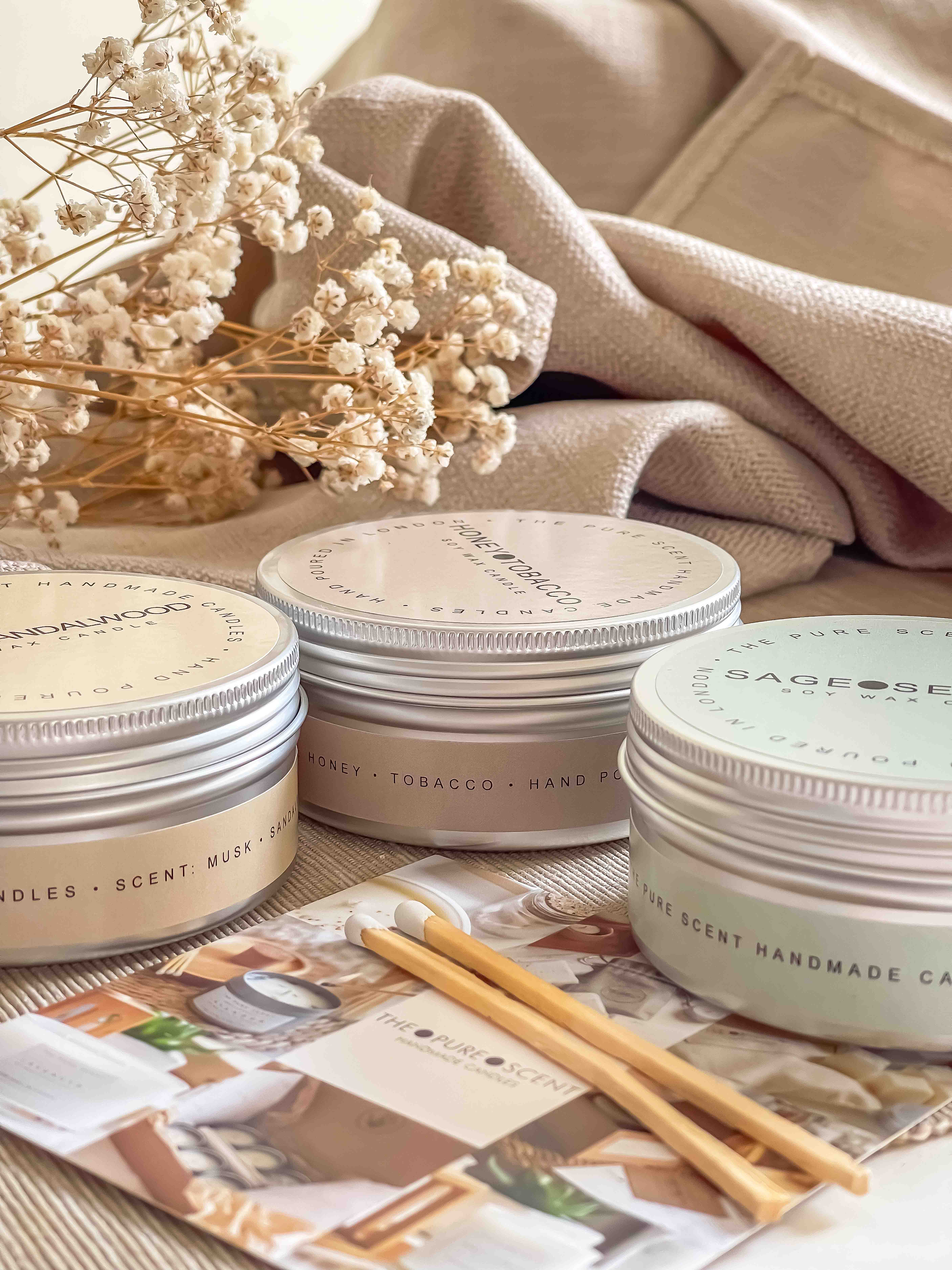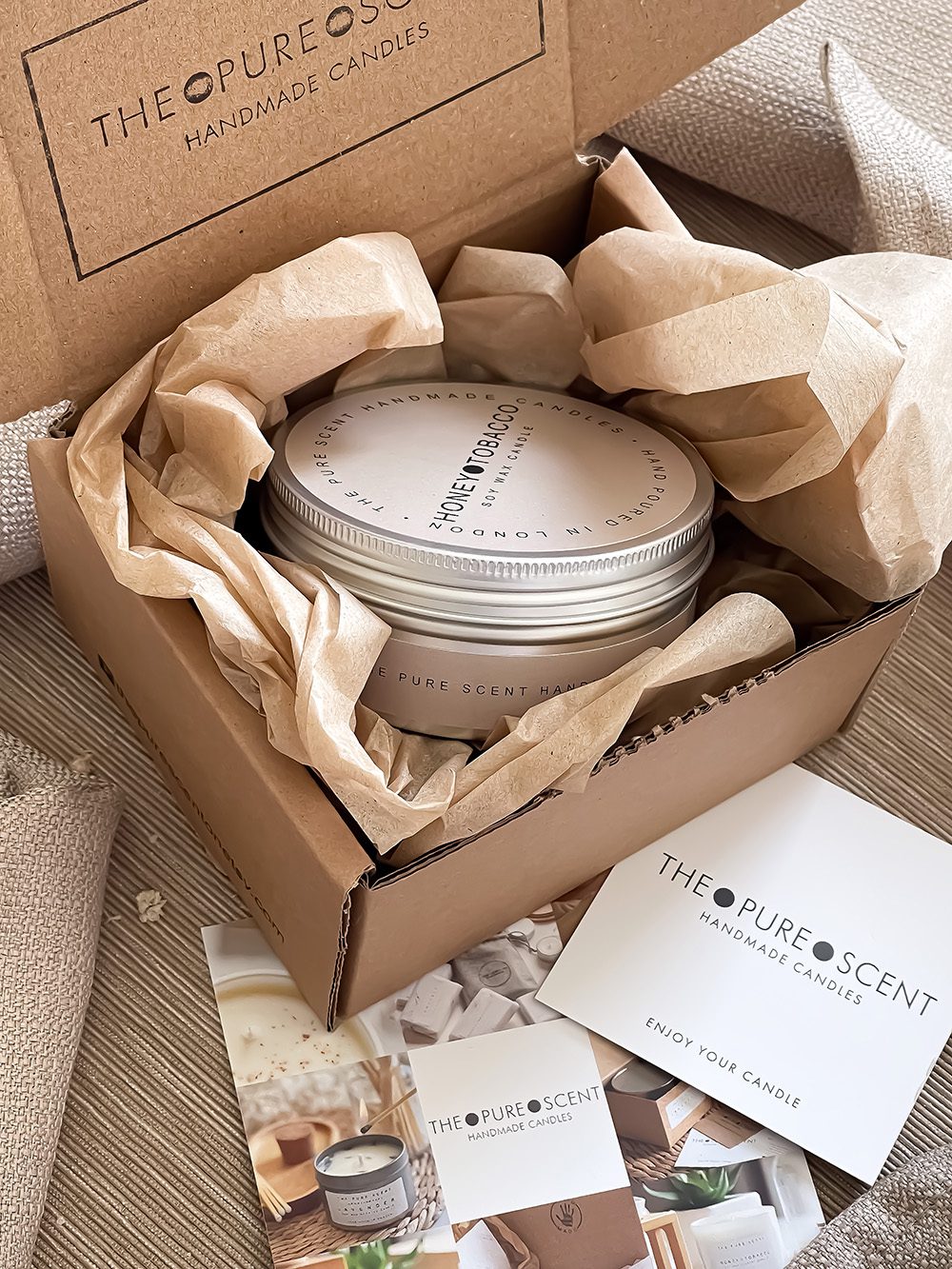 Welcome to The Pure Scent Handmade Candles. This minimalist candle made of 100 % pure soy wax can only mean one thing: A pure, clean, and lasting burn. Hand-poured in small batches in Walthamstow -E17.