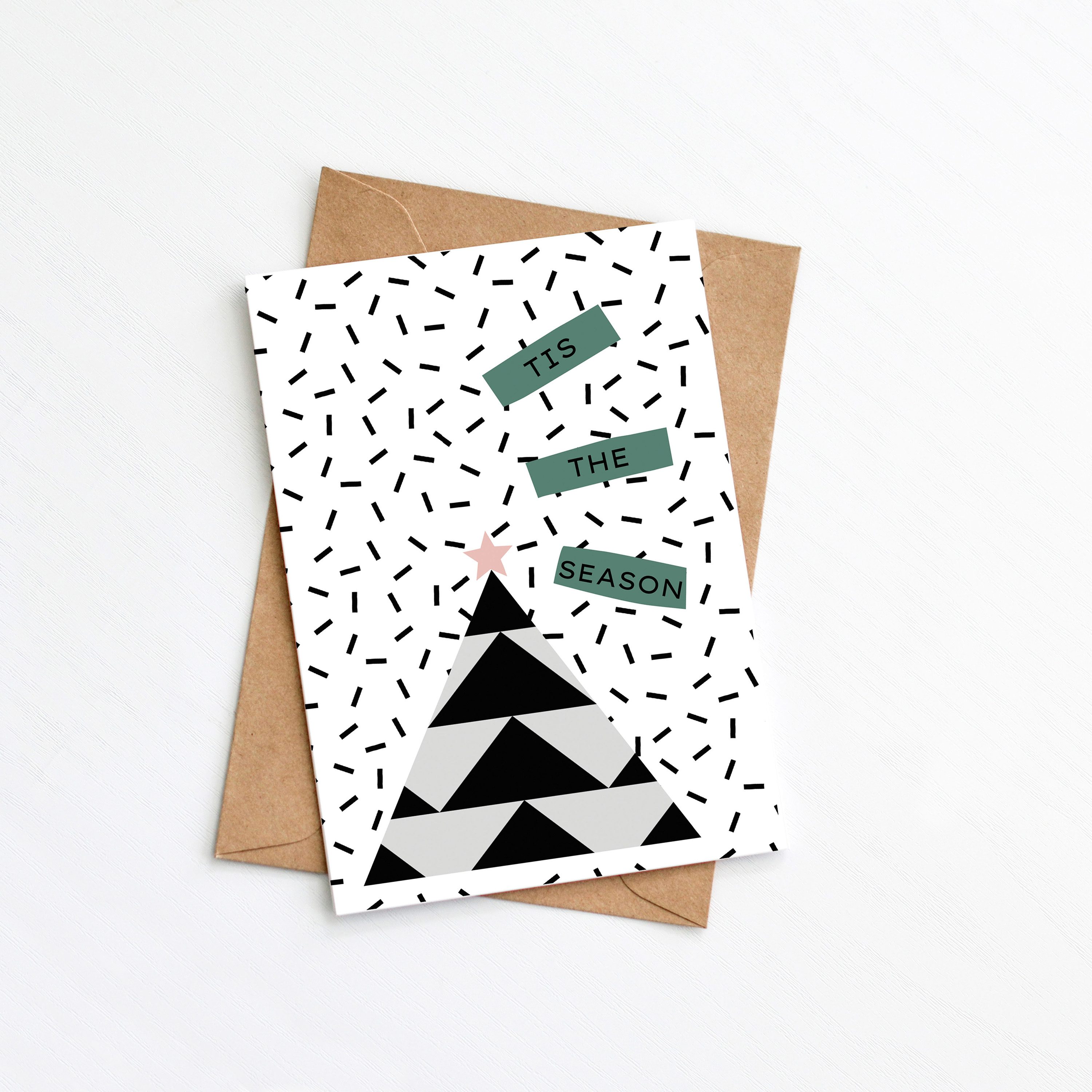 Contemporary Christmas card with geometric pattern and ‘Tis The Season’ message.