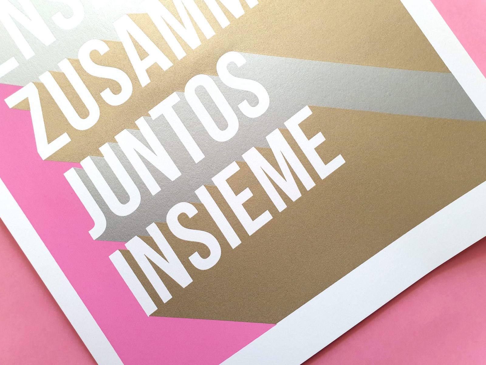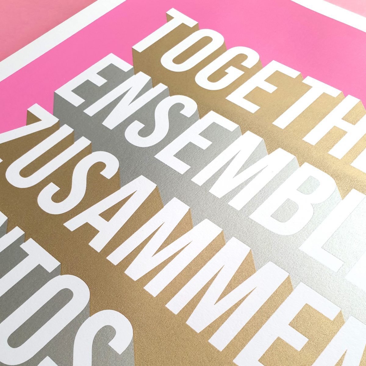 This Together – Limited Edition Screen Print is a 3-colour (pink, silver, and gold) hand-pulled limited edition screen print on high-quality paper. Artists use luxury gloss metallic inks on GF Smith 330 gsm Naturalis brilliant white paper stock. Each print features a signature and a unique edition number for authenticity.