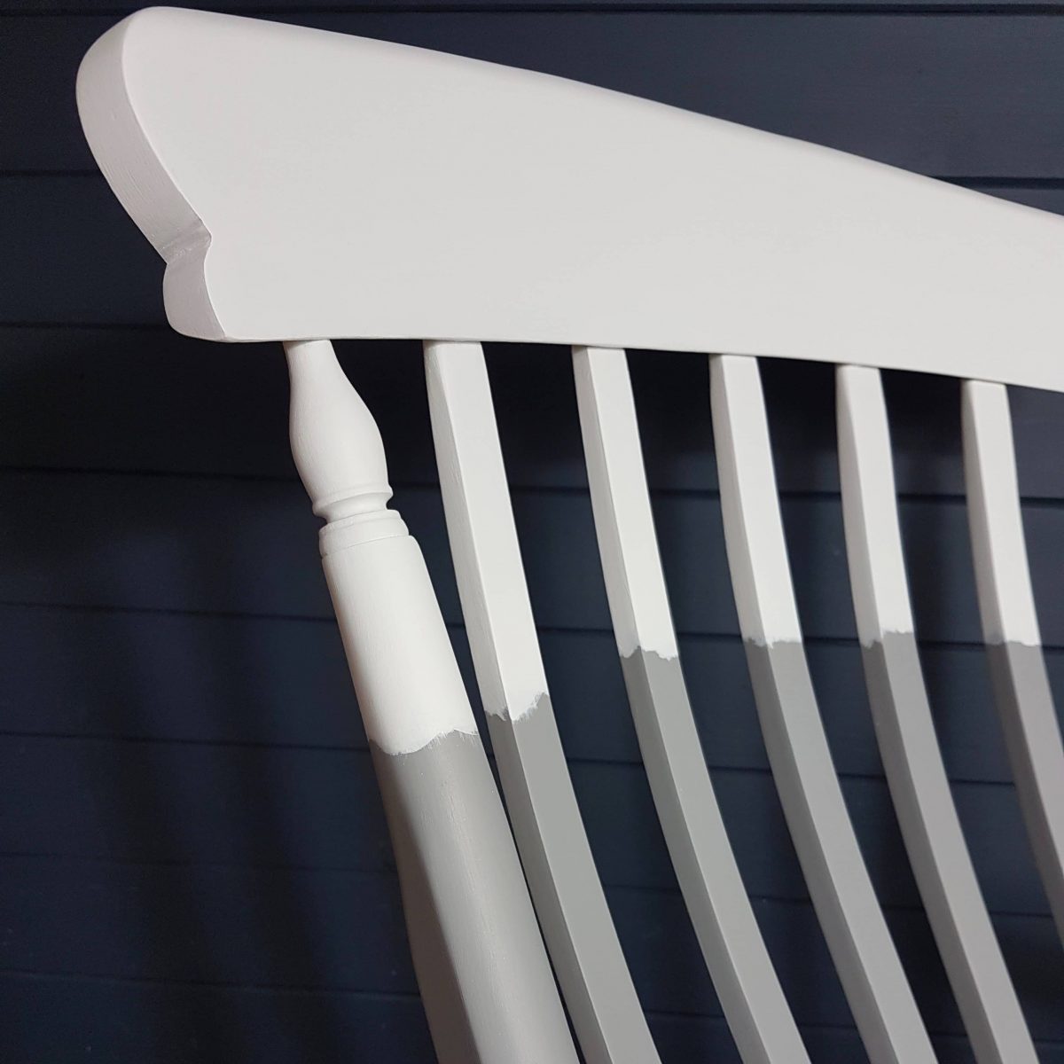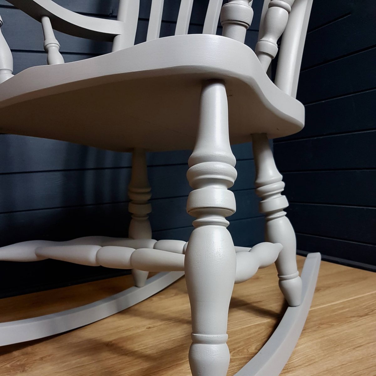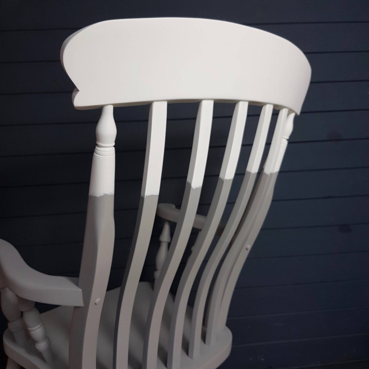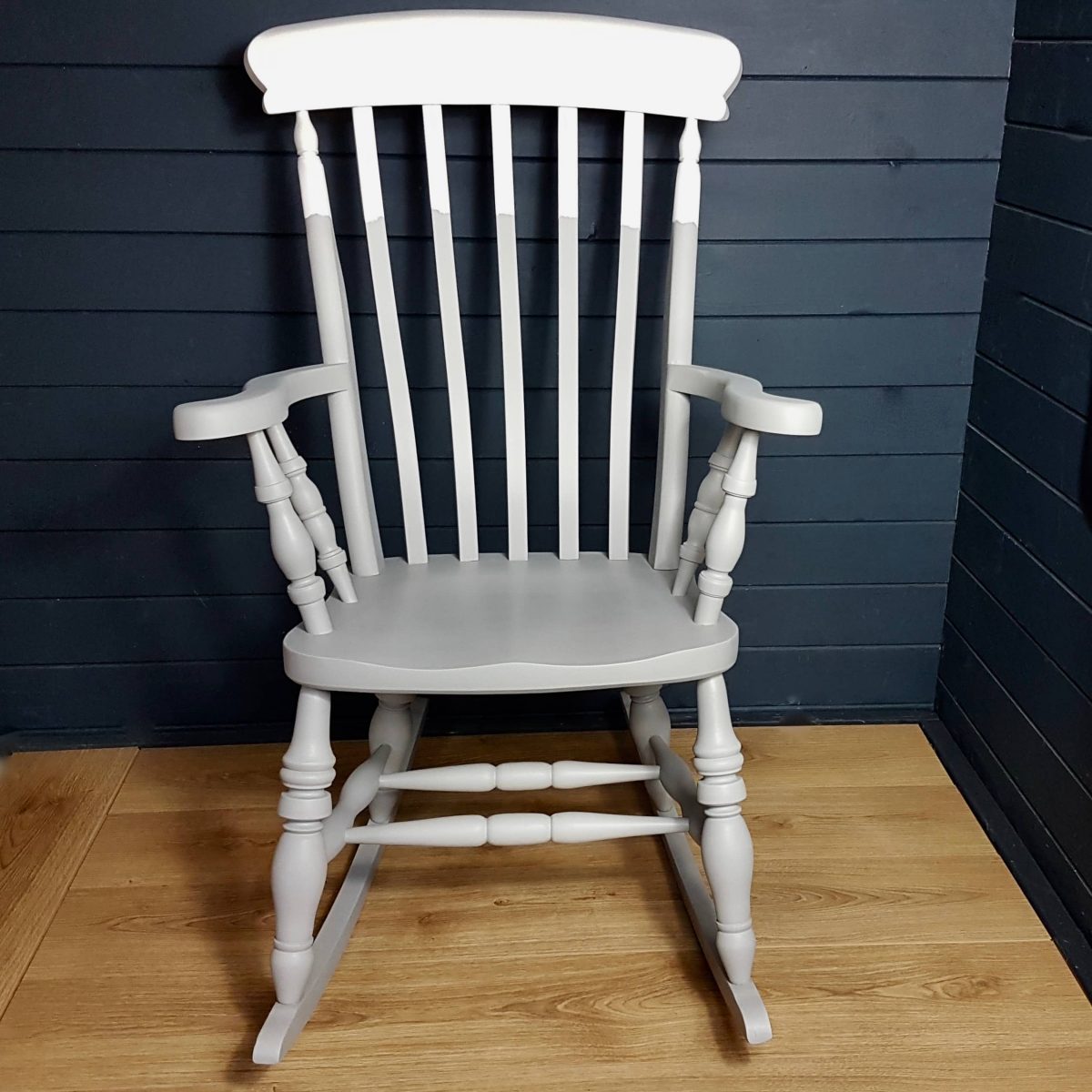 Two-tone grey and white painted wooden rocking chair.