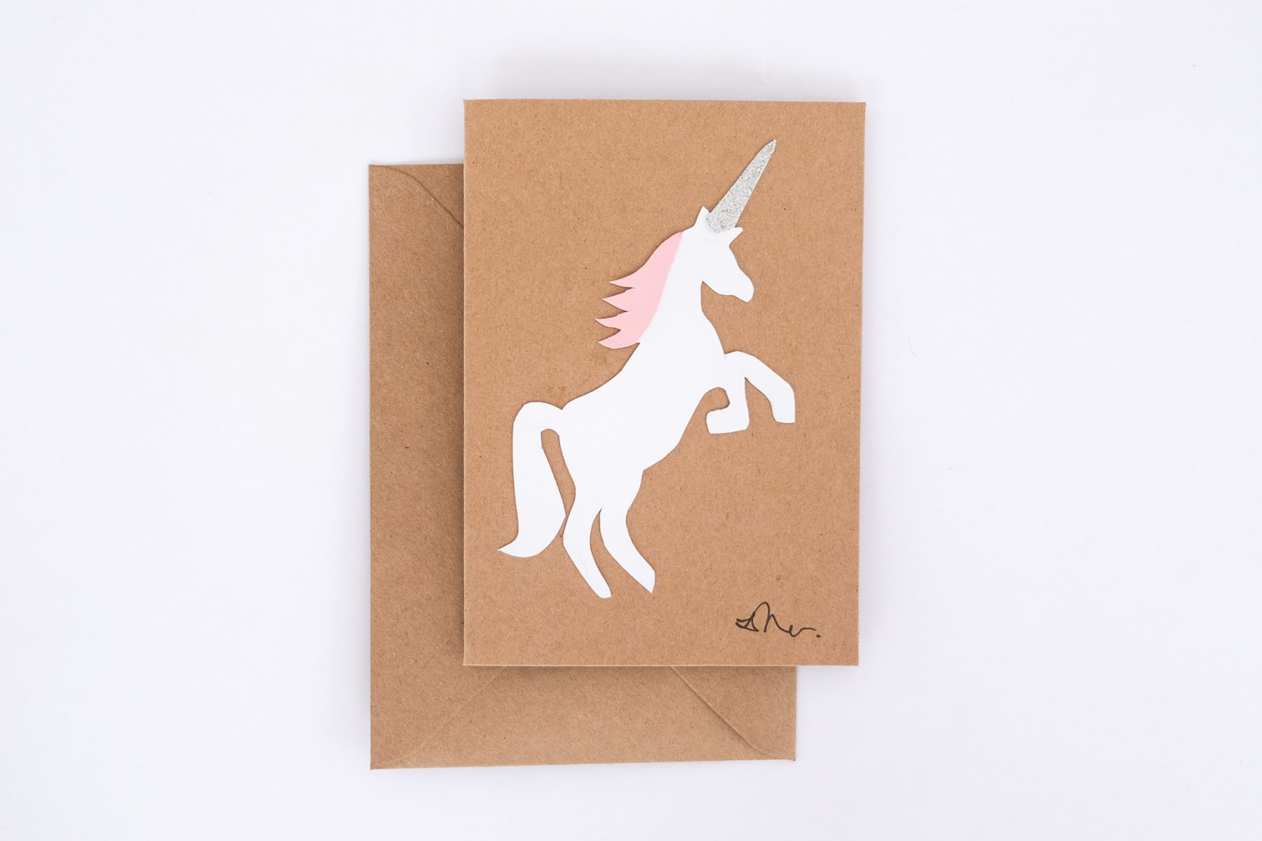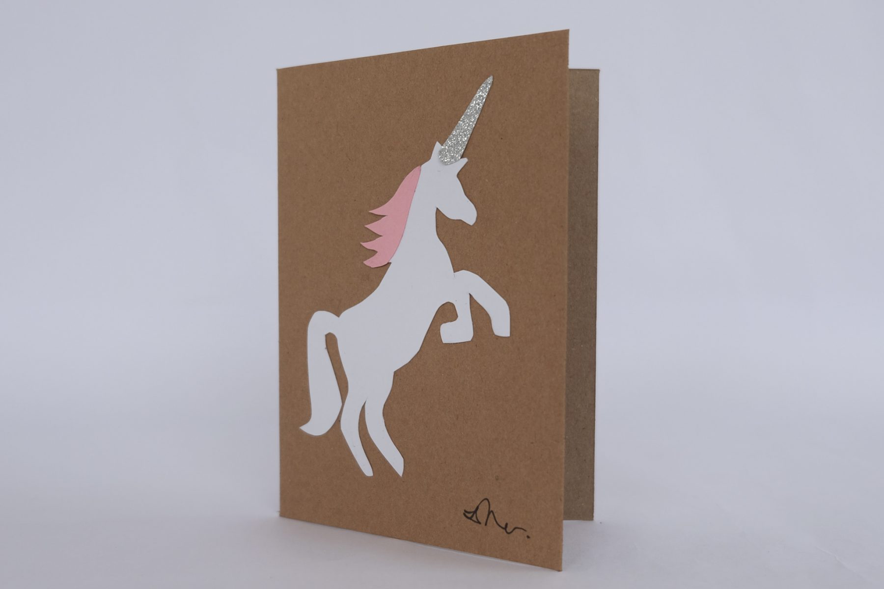 Handmade greetings card. A6 paper size and blank inside for you to write your own personal message. The Unicorn card is perfect for all occasions!
