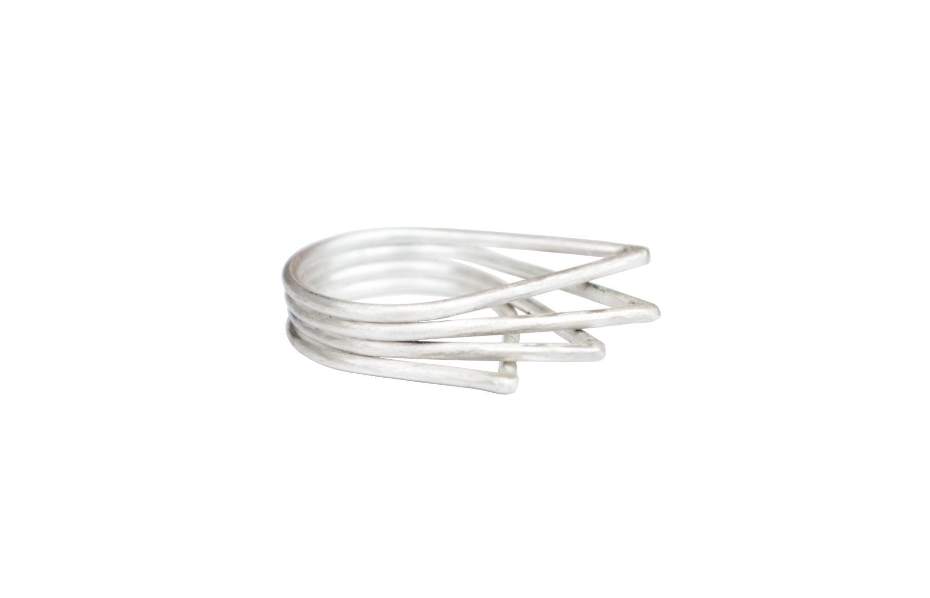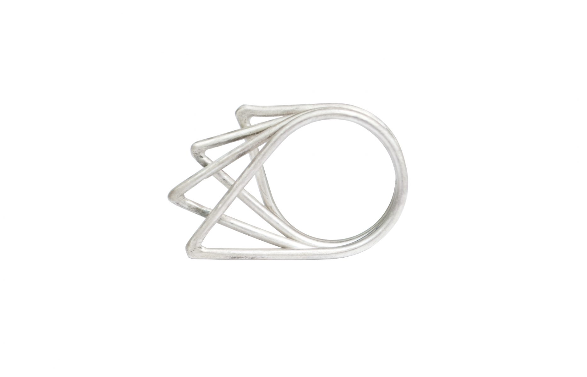 The ring is made of sterling silver wire, 1.5mm width, which have been formed into four drops that have been soldered together to create a geometric and minimalist ring.