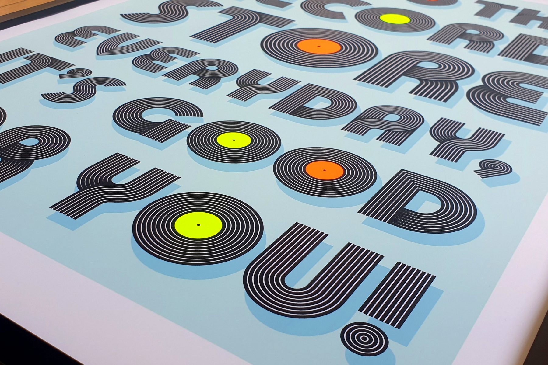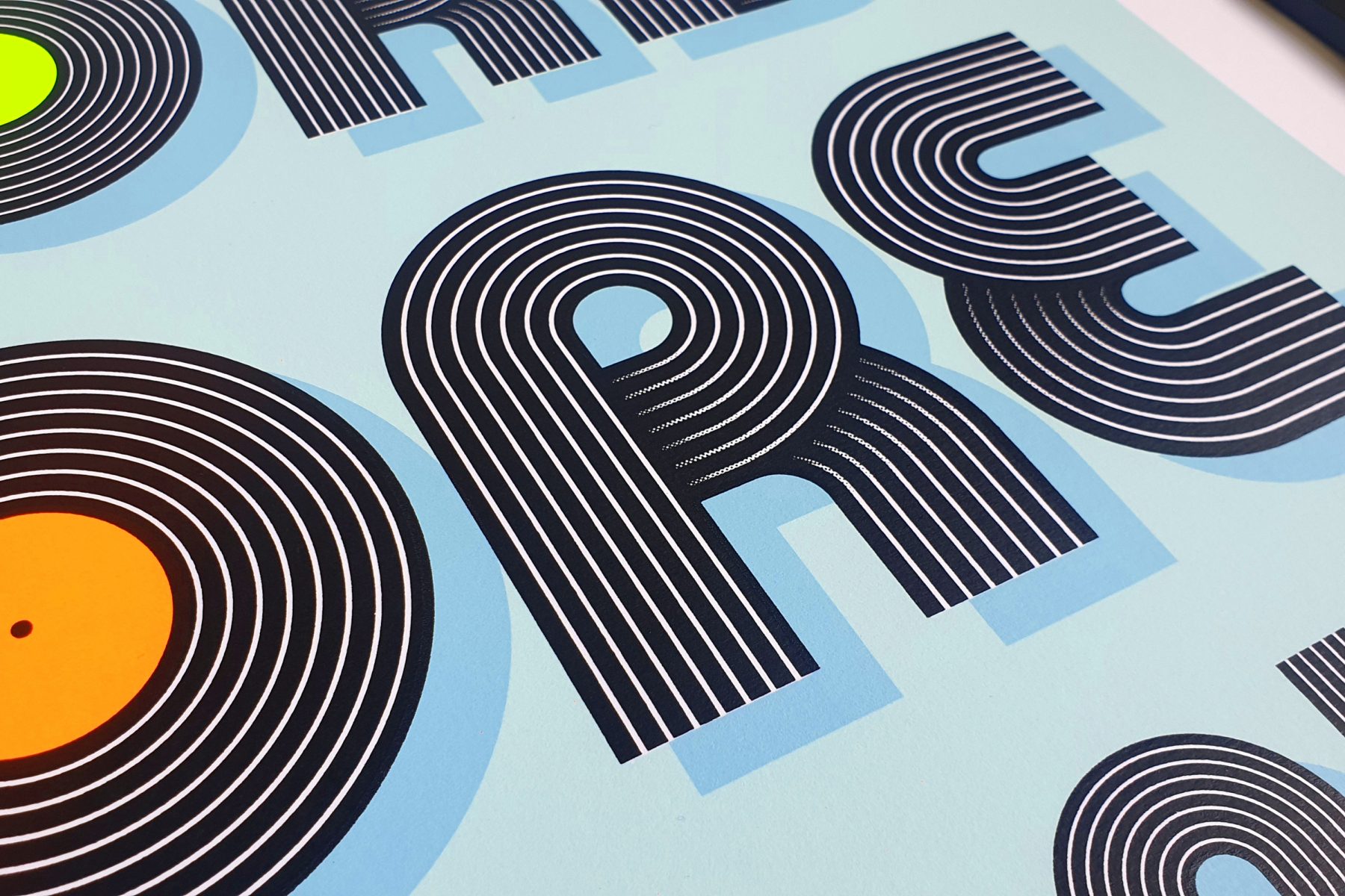 Vinyl Lover screen print captures the essence of music enthusiasts who cherish records and graphic art, creating a bold and vibrant statement. Designed with five hand-pulled color layers, this print embodies the passion and nostalgia of collecting vinyl records. Featuring custom typography, the artwork uses fluorescent and gloss inks printed on premium GF Smith 330 gsm Naturalis brilliant white paper. Inspired by the timeless beauty of black vinyl, this print resonates deeply with record lovers and collectors.