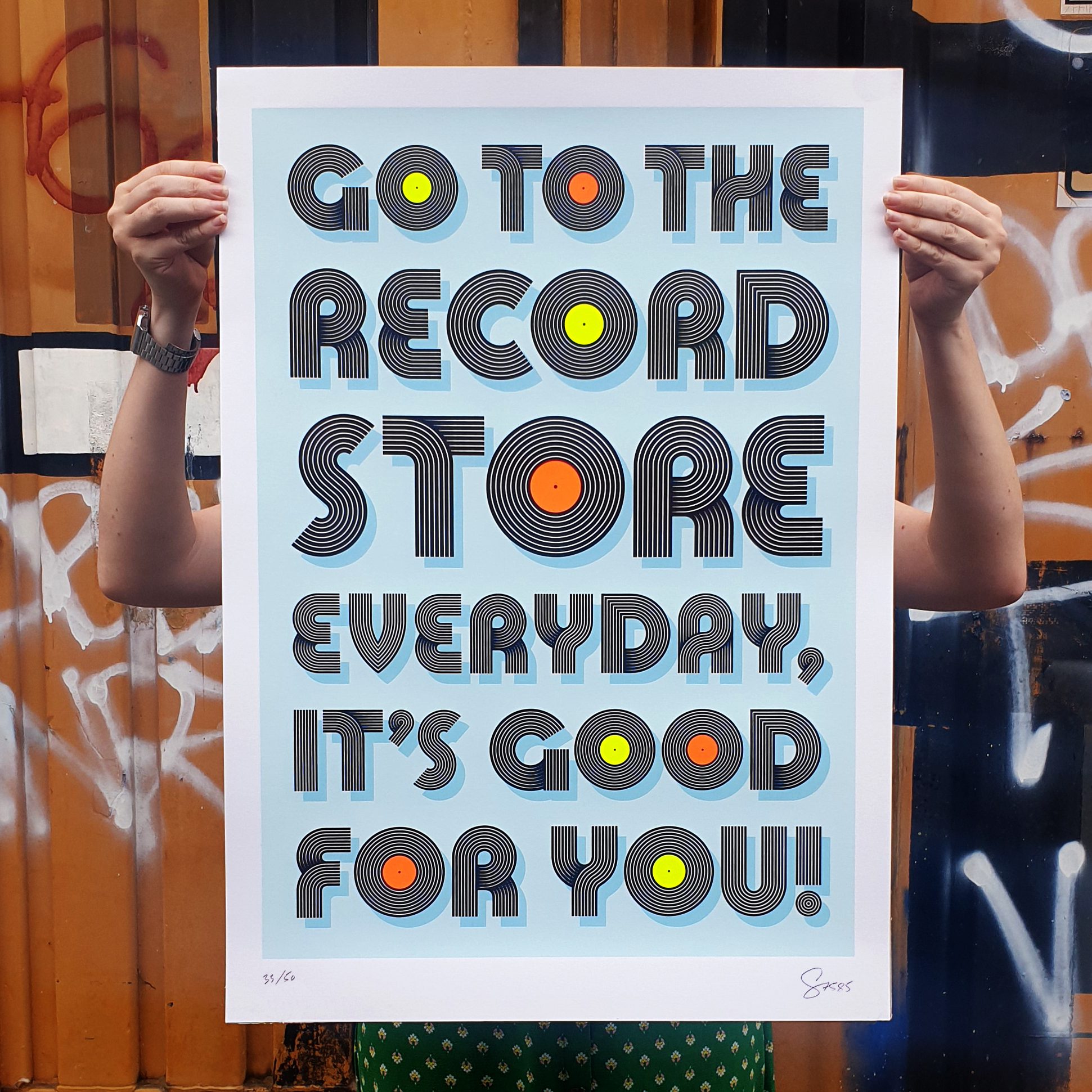 Vinyl Lover screen print makes the perfect gift for record collectors, audiophiles, and graphic art lovers who appreciate unique and meaningful artwork. The design emphasizes the famous mantra: “GO TO THE RECORD STORE EVERYDAY, IT’S GOOD FOR YOU!” This phrase resonates with vinyl enthusiasts who find joy in exploring and discovering records. The carefully curated composition blends creativity, nostalgia, and passion into a single captivating piece. Whether for a friend or personal collection, this print celebrates music’s visual and cultural impact.