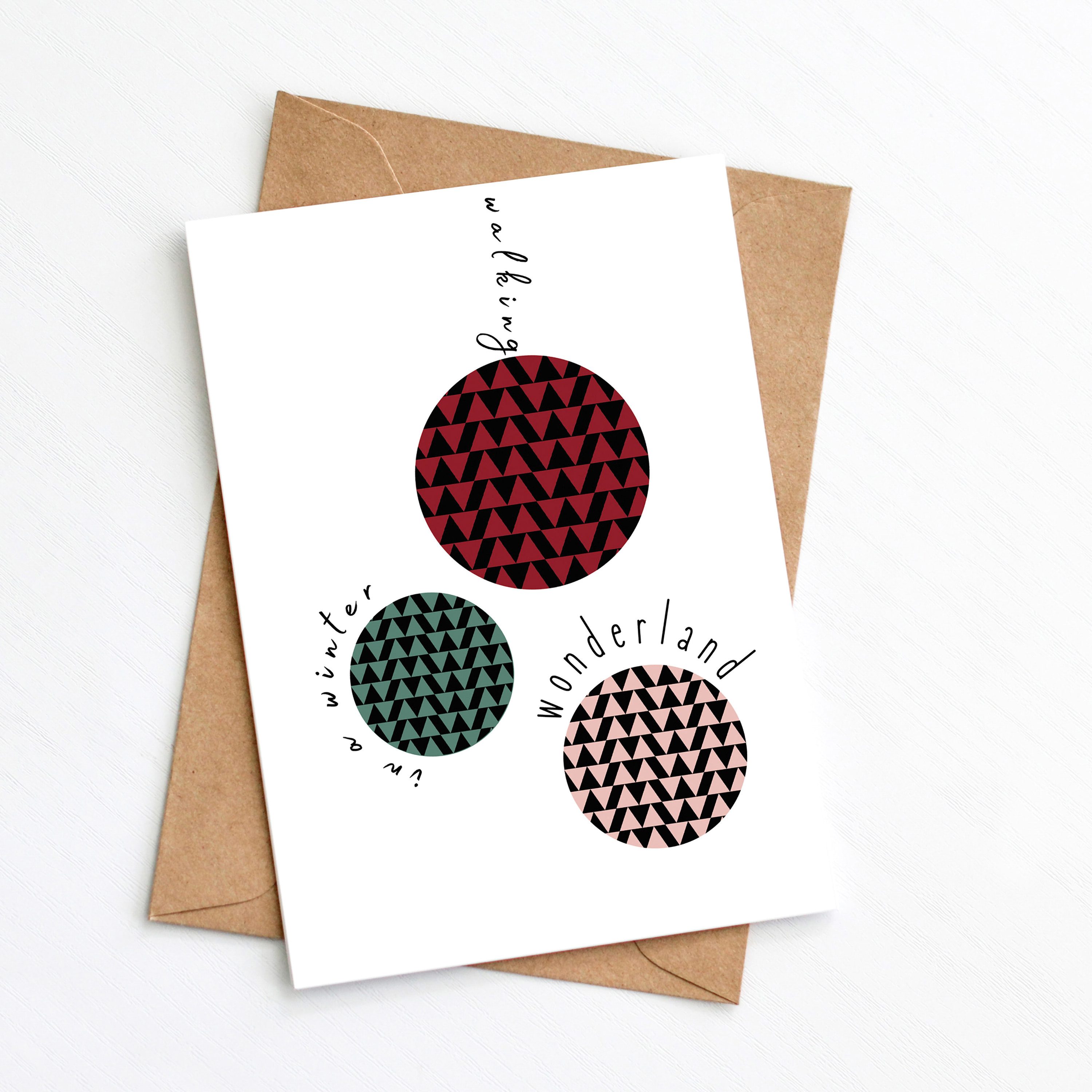 A contemporary Christmas card with colourful bauble design and ‘Walking in a Winter Wonderland’ message.