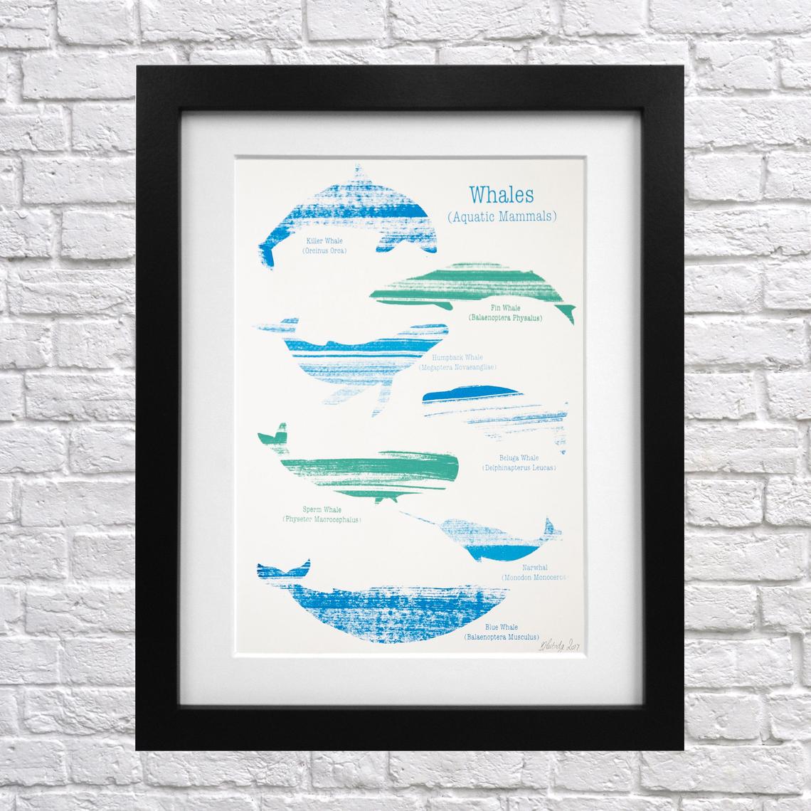 Whale Screen Print – animal print – whale picture – whale wall art – whale lover – educational poster – whale illustration – narwhal – killer whale – blue whale – natural history – educational print – whale poster