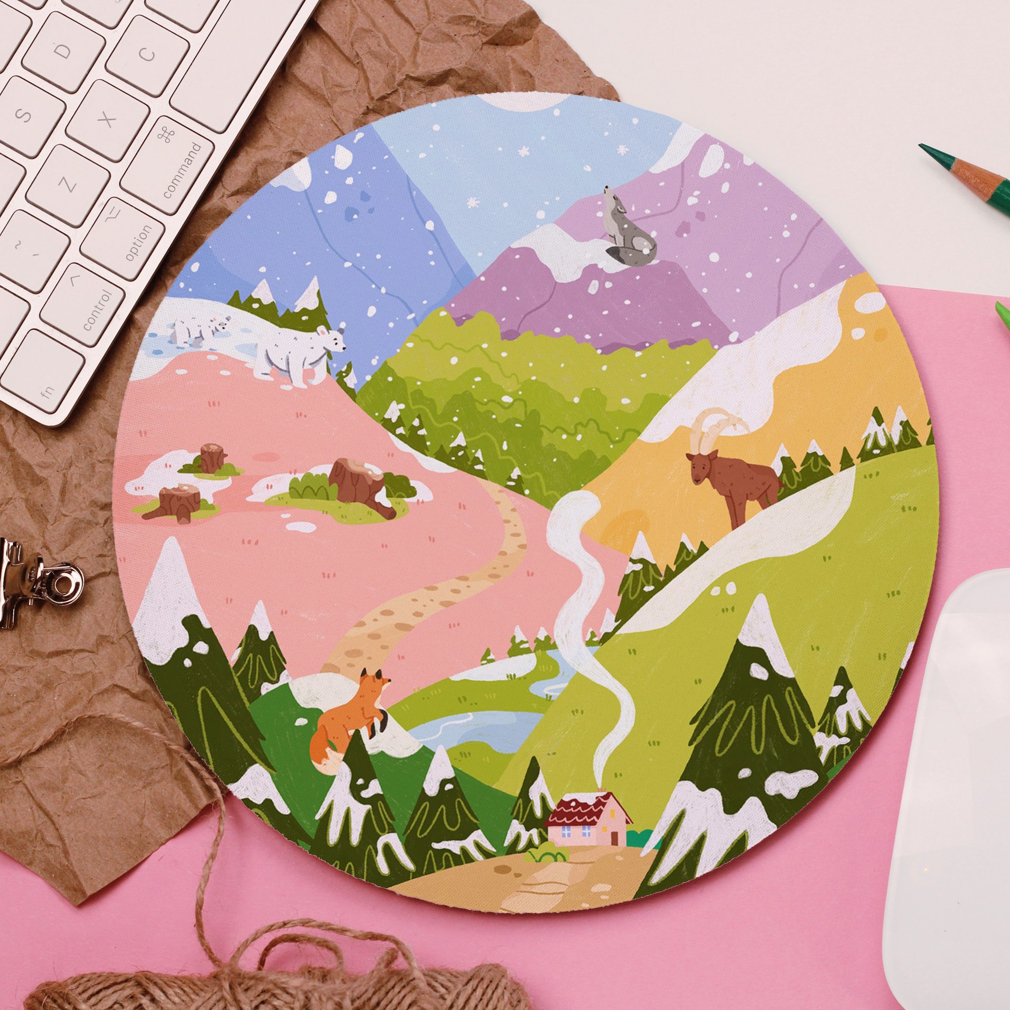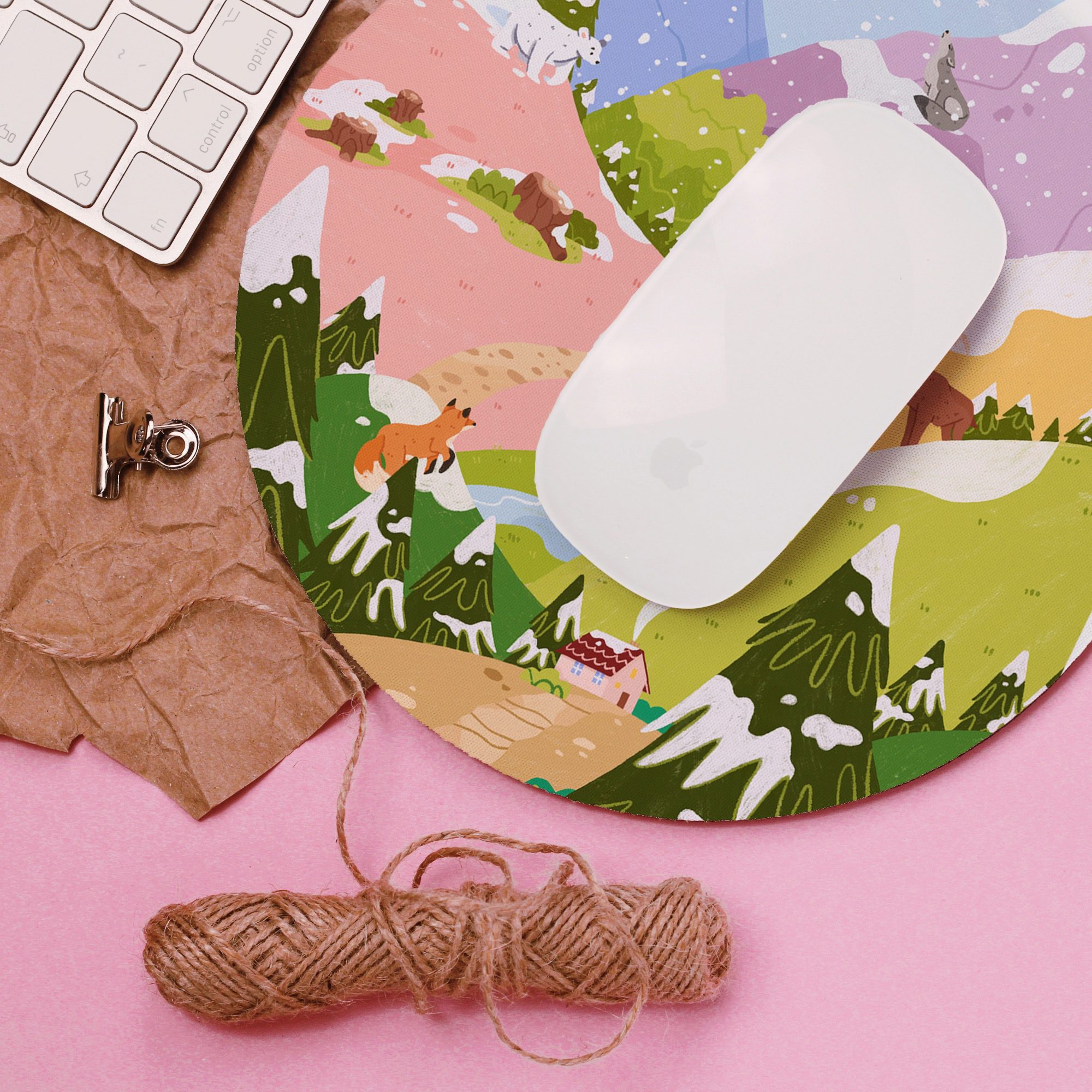 Winter Landscape Mouse Pad, Colourful Desk Art, Office Art, Cute Pastel Art, Fox, Hills