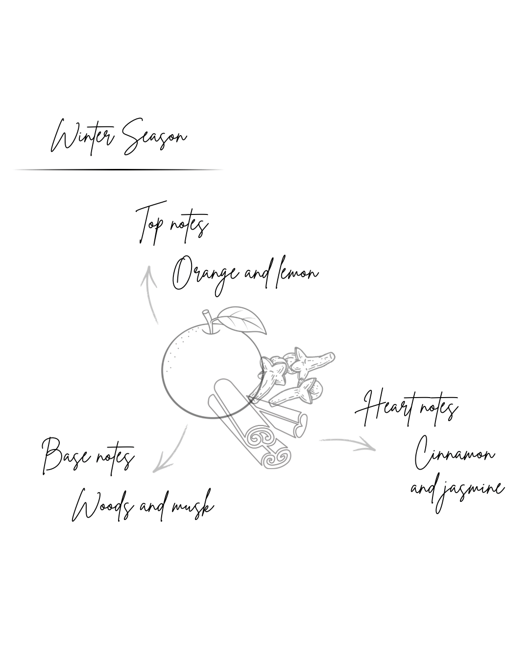 Winter Season is a fragrance that encapsulates the spirit of Christmas, evoking the cosy and joyful atmosphere of the Christmas season. Opening with strong bursts of citrus freshness, as the zesty notes of orange and lemon invigorate the senses. These vibrant top notes bring a bright and uplifting element, reminiscent of the sweet aroma of freshly peeled oranges and the tangy zest of lemons.
